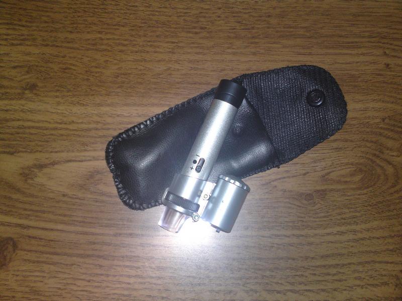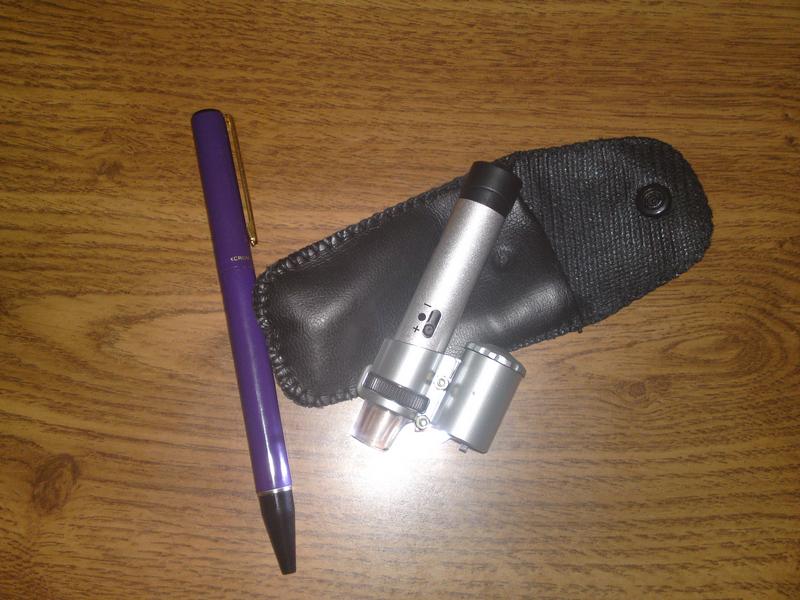Características Diseño boligrafo: se puede sujetar a un bolsillo. Cuenta con 2 LED para la iluminación y un LED UV. Ampliación 60x. Bolsa de piel protectora incluida.